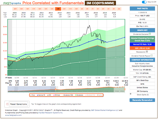 Con estos criterios de cribado, el filtro nos devuelve solo una compañía, 3M, una empresa que nos gusta, pero cuyo tamaño de posición es uno de los más importantes de la cartera. Además, su cotización está alrededor de lo que Morningstar (tres estrellas) y la imagen de FastGraphs considerarían su precio justo.